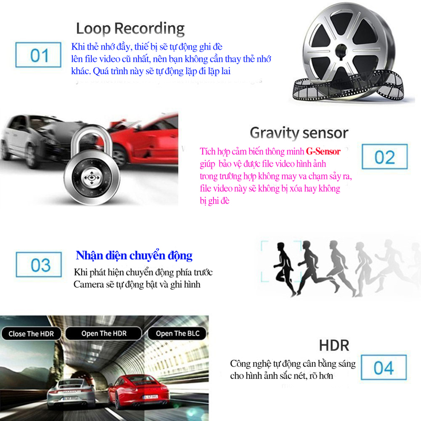 – Tích hợp cảm biến nhận diện chuyển động, và chuyển động xung quanh xe tự động ghi hình khi phát hiện chuyển động xung quanh xe.